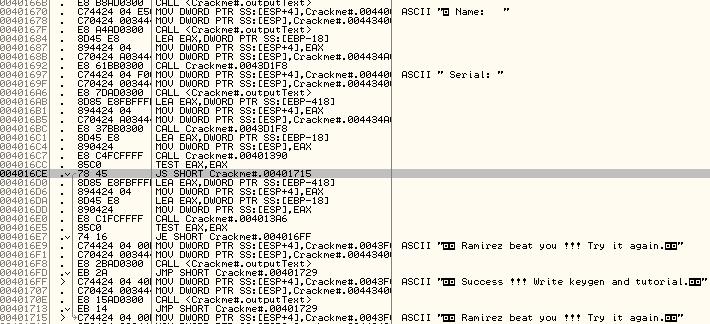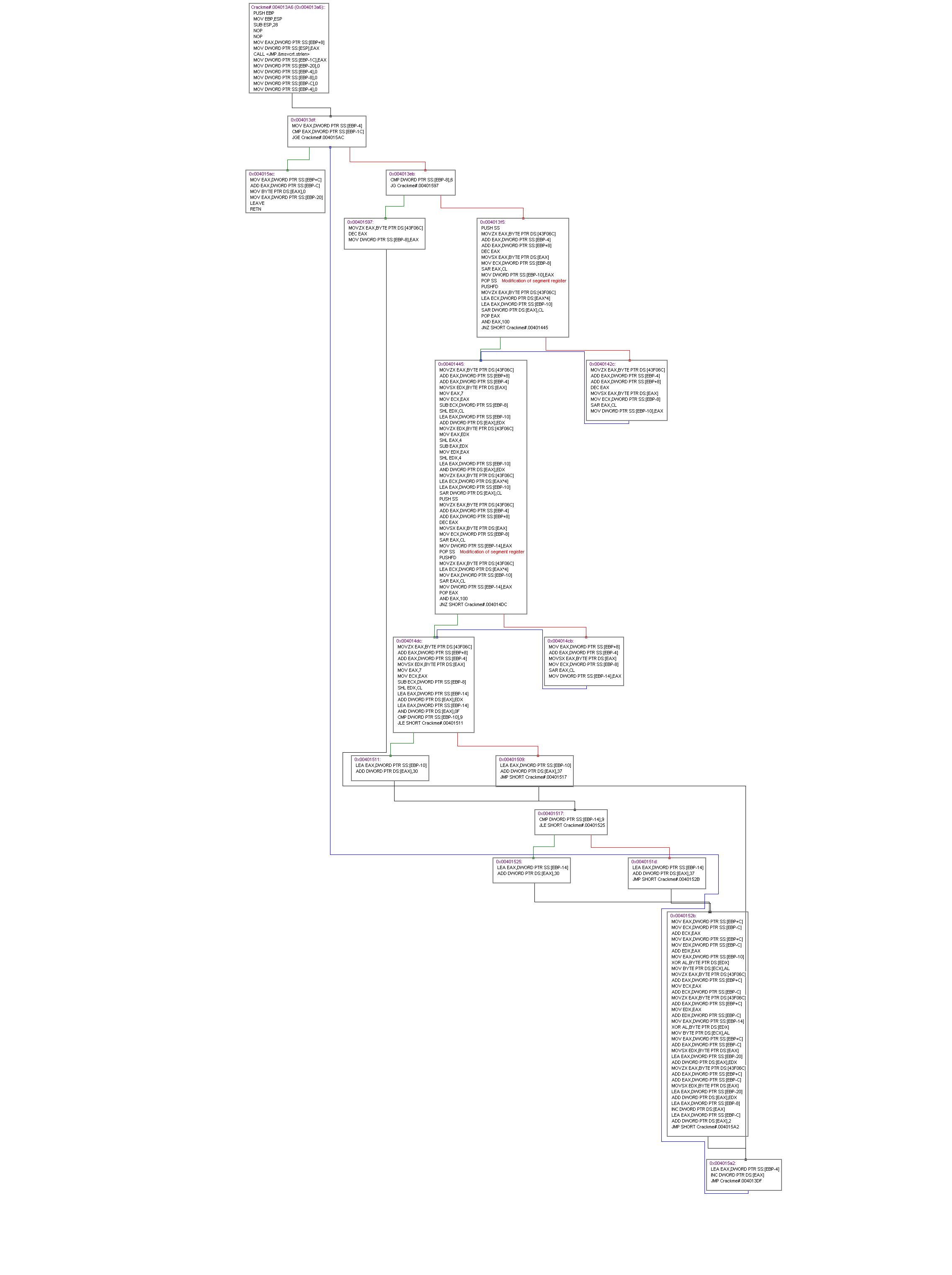Now that’s easy isn’t it? I felt very very very dumb for not sticking with the above sentence in past reversing assignments. Also graphical representations of the program flow are a big help. An example of a graph (created with immunity debugger) is as follow: