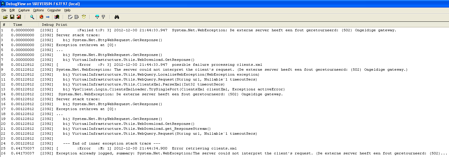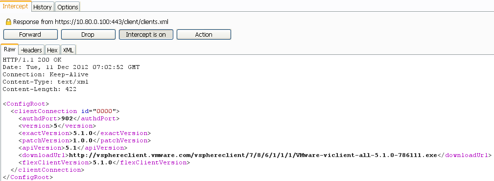 So we listen on all interfaces on port 443 and redirect traffic to the esxi host 10.80.0.100. Now out of curiosity we’ll also have DebugView running, you never know what messages an application might show you. If you set the burp proxy to intercept server responses you’ll see the following when the vvc requests the ‘/client/clients.xml’:
