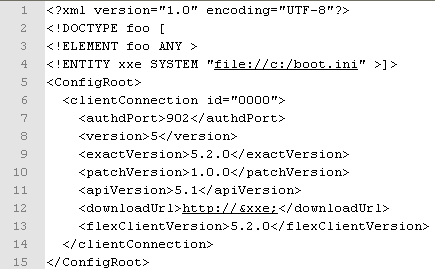 You can also deduce that the client uses XML for it’s communication since it requests ‘/client/clients.xml’. Which implies that the client might be vulnerable for several known XML attacks. Now let’s see if the client is actually vulnerable for some known XML attacks. The first attacks that came to my mind are: