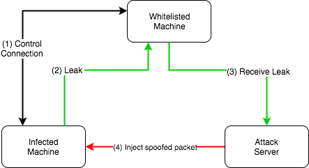 - The whitelisted machine will respond with a SYN/ACK towards our attack server, thus enabling us to receive the leaked information