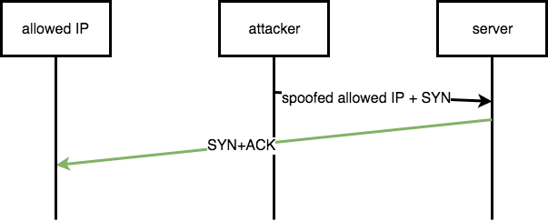 The above will arp poison the server (-t) (.186) and the gateway (.2) in both direction (-r) forcing the traffic towards our attacker machine. I’ll leave it as an exercise to you to figure out the extra steps to prevent a DOS on the target server ;) So we got the traffic, now what? Well the idea is really simple: spoof IP addresses that you think might be whitelisted and watch for the response, as visualised in the following image: