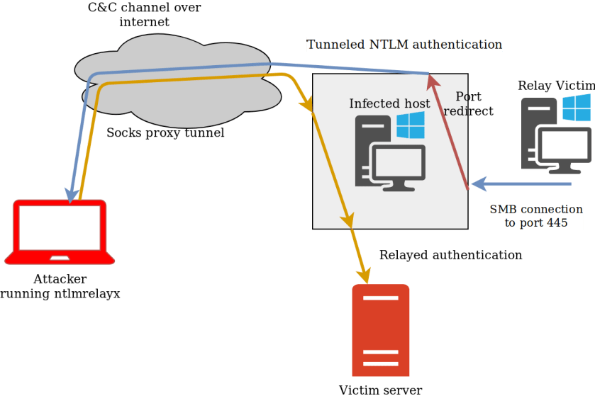 For the final setup we will use ntlmrelayx set up on an Ubuntu system, which will relay to a system inside our victim’s network. This involves forwarding the traffic both backward and forward through meterpreter. The backward connection is to ensure that when a host in the target network connects to our compromised host, this will reach ntlmrelayx, which can then relay it back to the target network. The connection back to the target network consists of a SOCKS proxy. The following image illustrates this attack:
