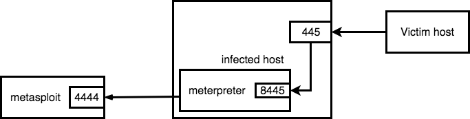 However we are lazy right? So creating a driver doesn’t sounds like the most ideal solution. Irony has it, that if you google around with the right keywords like wfp port connection you’ll actually find the solution already somewhat documented here by the author (@agsolino) of impacket himself. You’ll also get the windivert framework itself as a hit somewhere in the results. If you keep searching around a bit more you’ll actually find the solution as linked at the beginning of this entry, which is a easy to use application to redirect incoming connections. Now let’s see how to use this to redirect incoming connections on port 445 on an infected system, through meterpreter. The image below visualizes what we are going to do with our newly found toy: