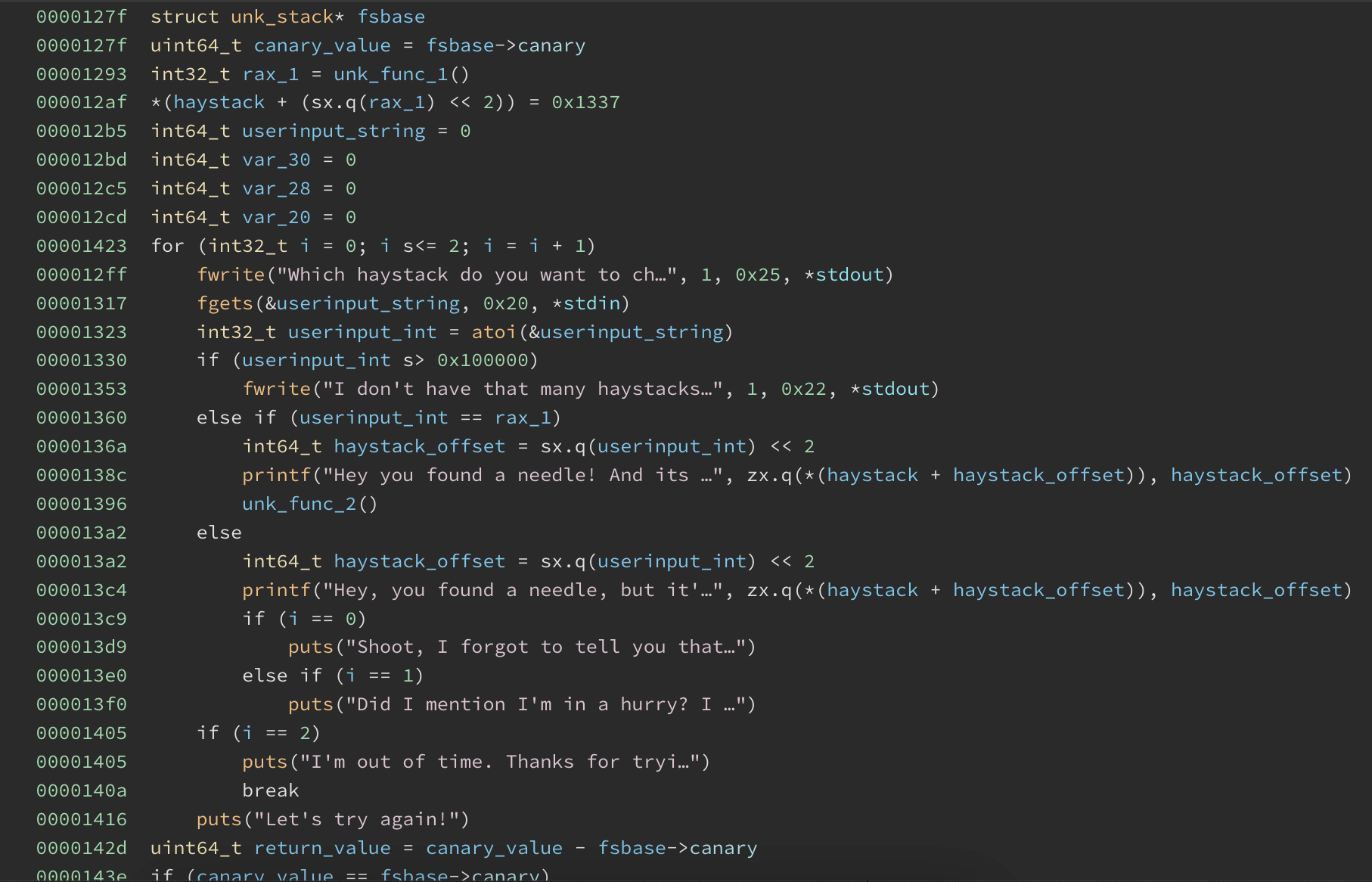 You probably noticed that on 0x1293 and 0x1396 I renamed the two functions to something with the ‘unk_’ prefix. This is a personal preference that I use to acknowledge that I’ve seen the functions, but got no clue what they do. This helps me to revisit them when I have more context. First let’s look at the unk_func_2() since that one says we found a needle! Which immediately tells us that it provides a shell, since the code is just ‘system(“/bin/sh”)’, thus we rename this to ‘winner_shell’. Now let’s look at the unk_fun_1: