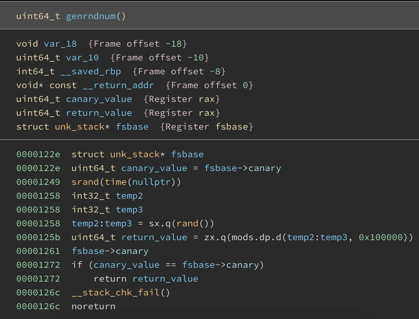 Here we again see that the function starts with the ‘fsbase’, which if we search online for it, it is the FS segment register and on position 0x28 you’ll find the stack canary. It goes beyond the scope of this post to explain the FS/Stack Canary things, but do look them up! Like before let’s make this a bit more readable then, by renaming RAX on 0x144A to ‘canary_value’. We are also going to define the right type, let’s assume we don’t know the full fsbase structure, in the types overview we then create the following new type: