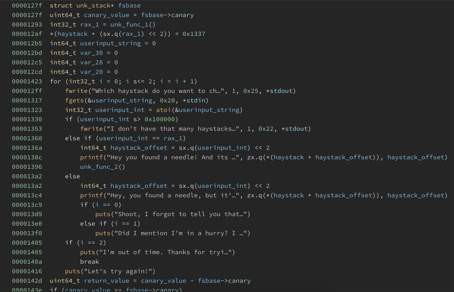 You probably noticed that on 0x1293 and 0x1396 I renamed the two functions to something with the ‘unk_’ prefix. This is a personal preference that I use to acknowledge that I’ve seen the functions, but got no clue what they do. This helps me to revisit them when I have more context. First let’s look at the unk_func_2() since that one says we found a needle! Which immediately tells us that it provides a shell, since the code is just ‘system(“/bin/sh”)’, thus we rename this to ‘winner_shell’. Now let’s look at the unk_fun_1: