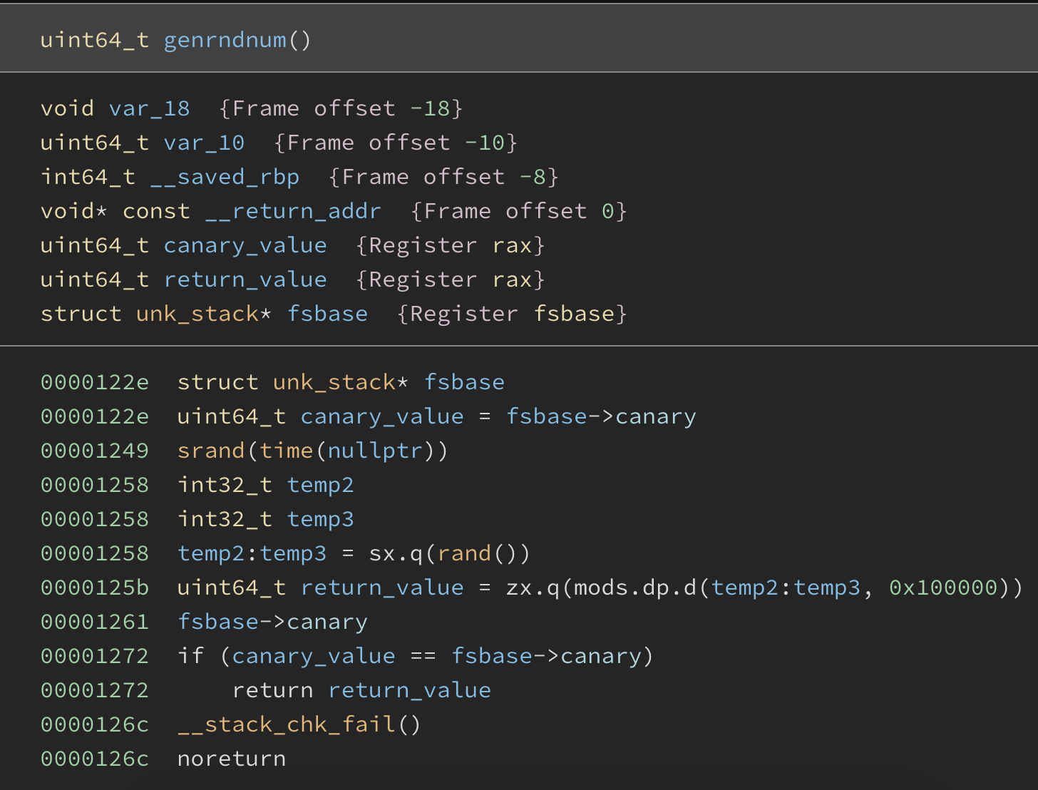 Here we again see that the function starts with the ‘fsbase’, which if we search online for it, it is the FS segment register and on position 0x28 you’ll find the stack canary. It goes beyond the scope of this post to explain the FS/Stack Canary things, but do look them up! Like before let’s make this a bit more readable then, by renaming RAX on 0x144A to ‘canary_value’. We are also going to define the right type, let’s assume we don’t know the full fsbase structure, in the types overview we then create the following new type: