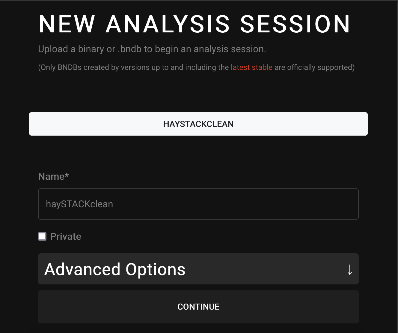 Opening up the binary in Binary Ninja (binja from now on) is as easy as hitting “New Session”, selecting the binary and then hitting continue. You can check the ‘private’ checkbox if you so desire.