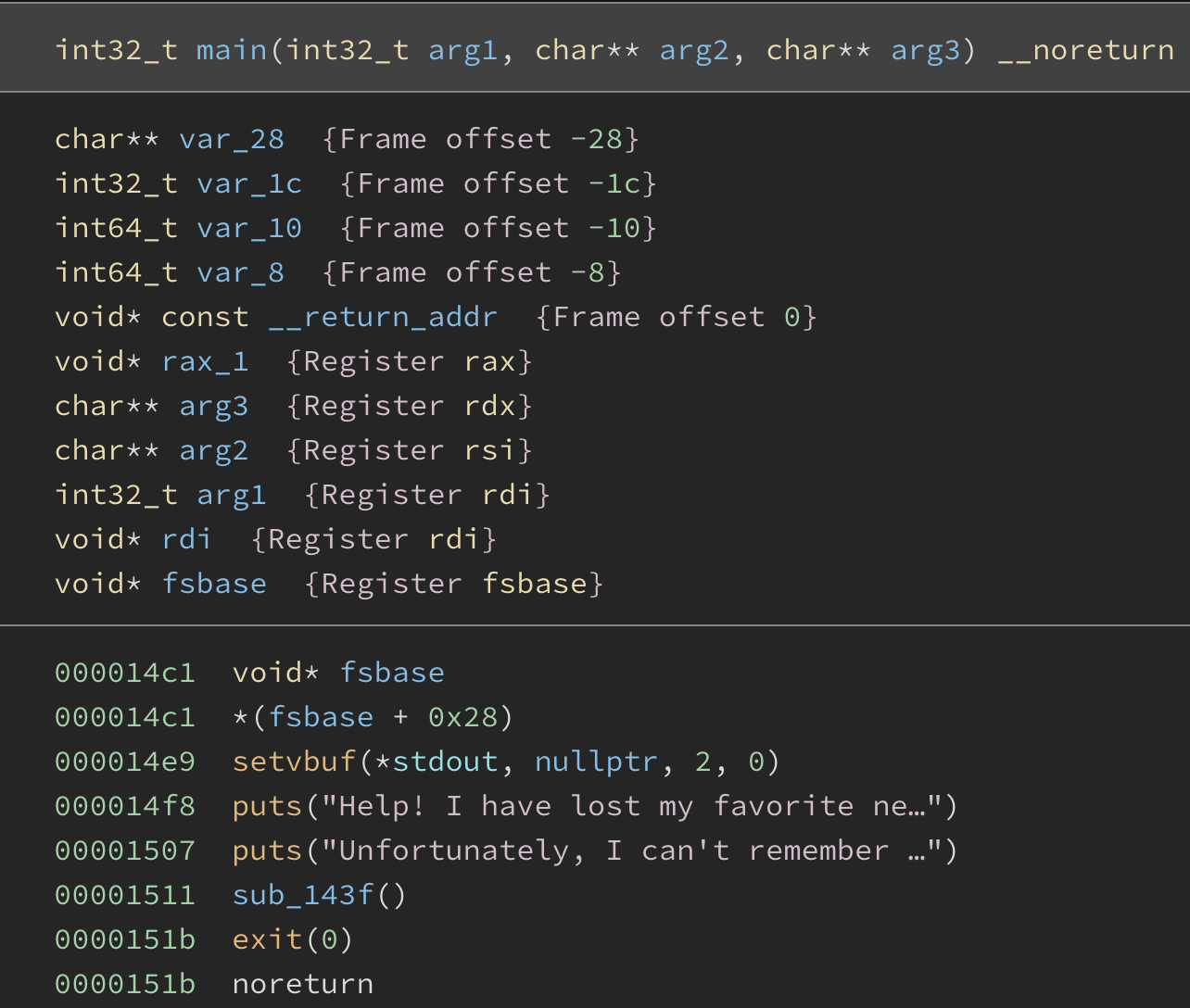 This looks familiar (if you’ve worked with other disassemblers) we can see the local variables at the top and then we see the content of the main function. For now let’s focus on the functions that we recognize: