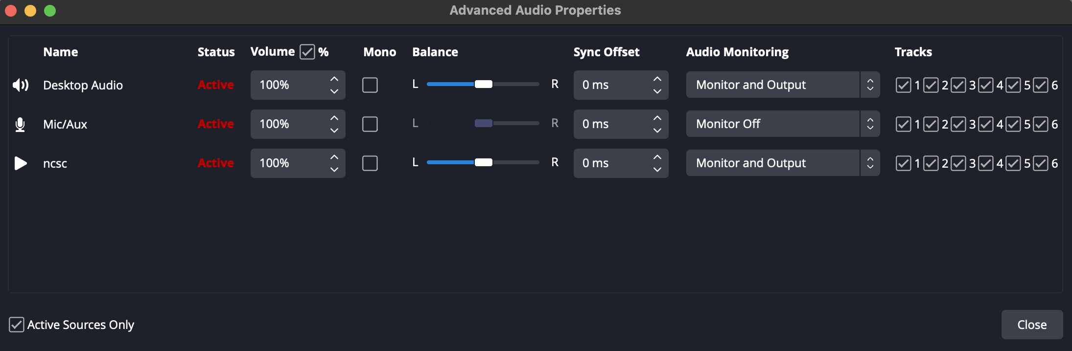 Under sources you add the video file using the + sign and you add your second screen, also using the + sign. I chose “Display Screen” for the screen recording part. Then under Audio Mixer you click the cog icon and you make sure that you put the “Desktop Audio” as well as your video input on “monitor and output”. Just to be sure I muted the “Misc/Aux” audio source in the main mixer screen.