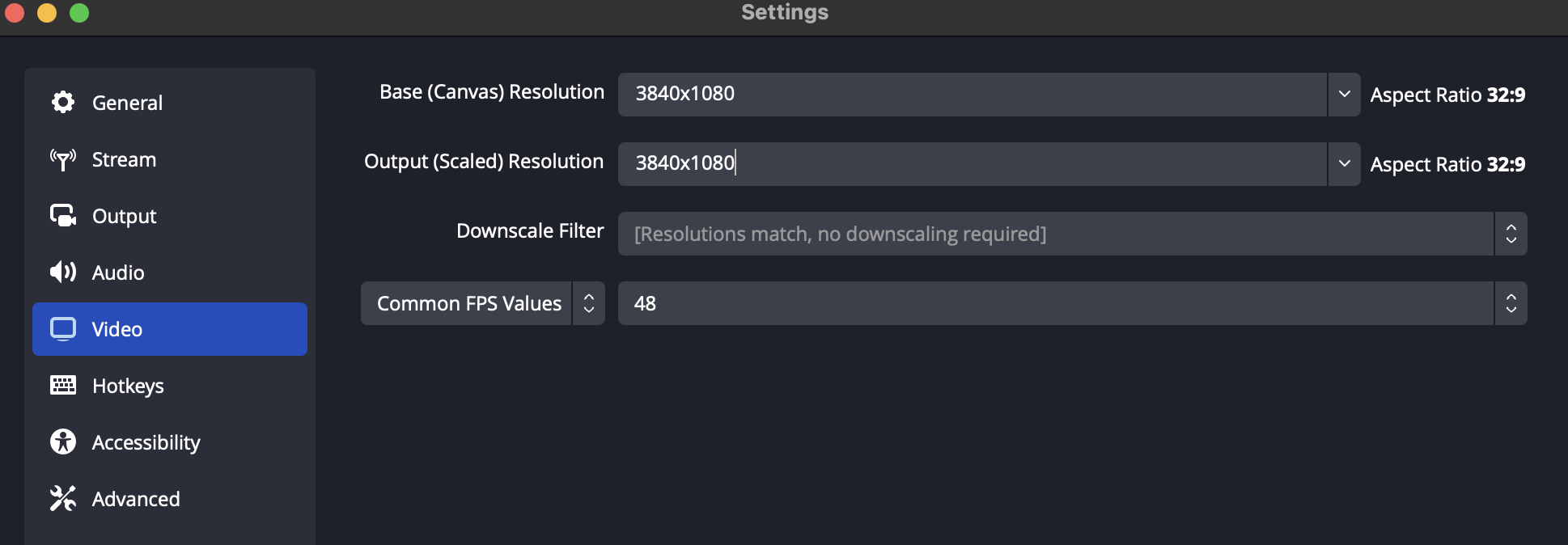 Lastly you need to play around with the input and output size under “Settings” on the right side of the OBS screen. Since I’m no expert I just chose a screensize that allowed for both inputs to be next to each other.