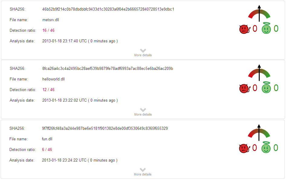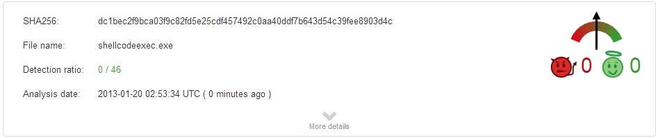 We could try and make meterpreter FUD by changing even more compiler / linker options (or even the source itself), but this would require more testing, clicking, uploading and since I need to catch some sleep, I’ll leave that as an excersize for the reader. Hope you have fun recompiling all kind of tools out there and if you run into errors just copy/paste them into google or bing.