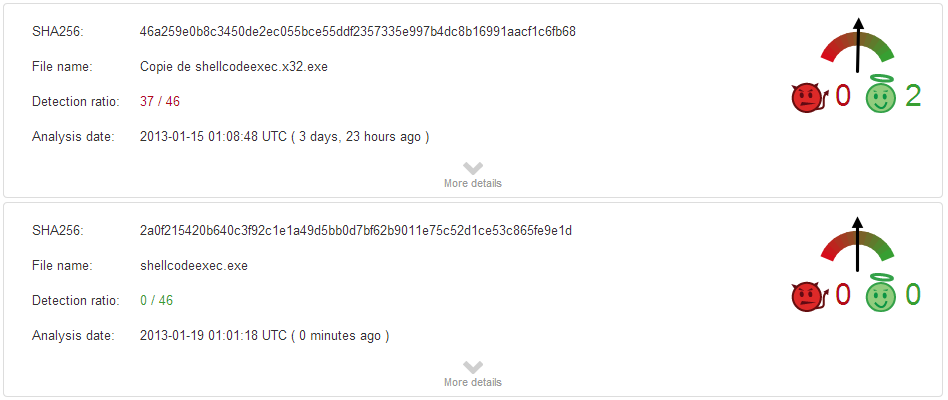 Still if you are looking for an EASY way to lower the detection rate of your tool, this is pretty nice. Besides being easy it also gives you a lot of freedom to just change the code slightly and probably reach that much desired “fully undetected” goal.